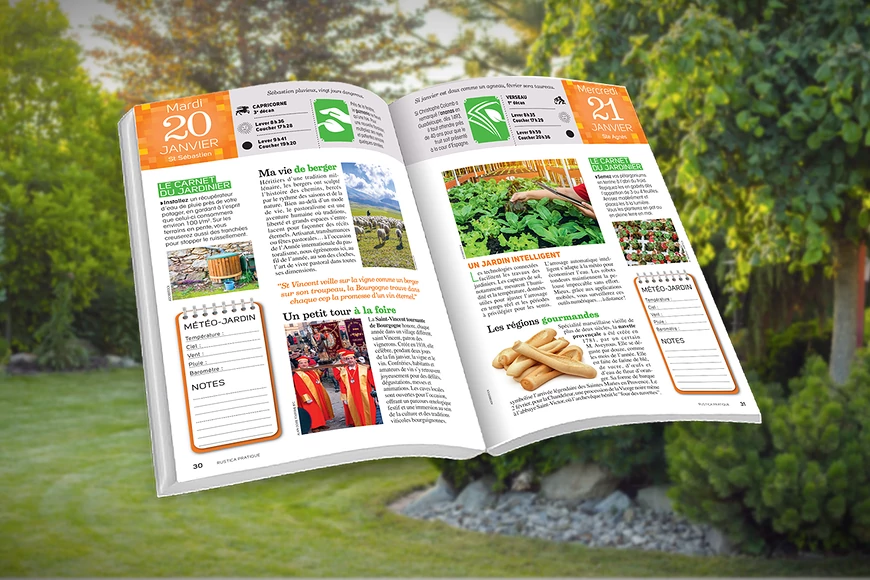 Michèle reçoit tous les ans l'almanach Rustica ! Elle avait amené l'exemplaire 2026 et découpé certaines feuilles dans l'une des éditions précédentes. Elle nous a distribué ces feuilles et un modèle d'une page d'almanach vierge.