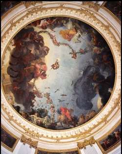 Comme chaque année, je me renseigne sur les possibilités de visiter l'Elysée et comme chaque année, la queue dure plusieurs heures et je remets ça à l'année suivante. Je cherche alors une autre destination. J'aime bien ces journées qui me motivent à sortir. Après quelques clics, je me décide pour le parc de Sceaux. La journée est ensoleillée et c'est un plaisir de traverser pelouses et bosquets sous la douce chaleur de septembre. Arrivée au château, la visite est exceptionnellement gratuite et la file d’attente quasi inexistante. Par contre la déception est grande. En lieu et place de l'exposition attendue sur des monnaies anciennes : trois vitrines peu attrayantes présentent quelques piécettes peu mises en valeur. Les autres salles semblent sans âmes, encombrées d'un mobilier disparate. Je ressors un peu dépitée. Je me dirige sans vraiment d'allant vers le pavillon de l'aurore. Cette élégante construction classique, commandée par Colbert, se compose d’un salon en rotonde encadré de deux cabinets quadrangulaires. La coupole de Charles Le Brun, restaurée, est de toute beauté. Allégorie de l'Aurore elle donne son nom au pavillon. J'ai la chance d'avoir un conférencier bénévole qui explique une partie des subtilités de la peinture :